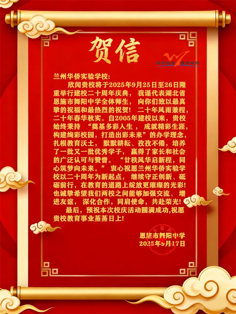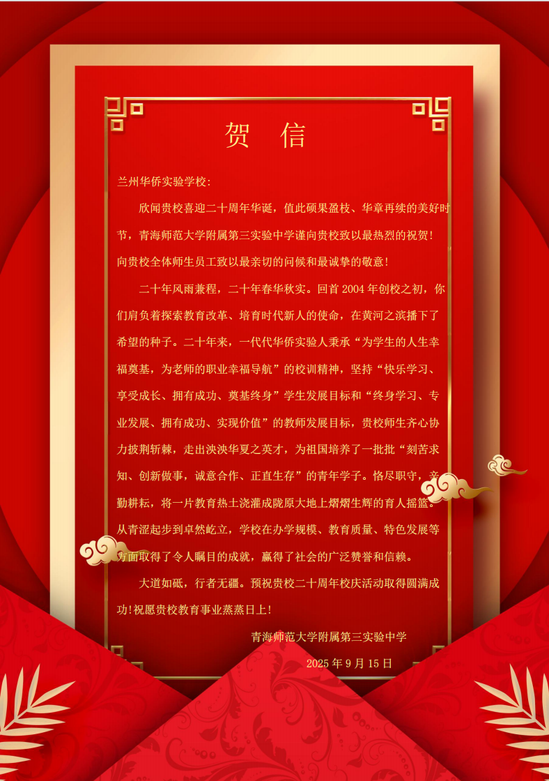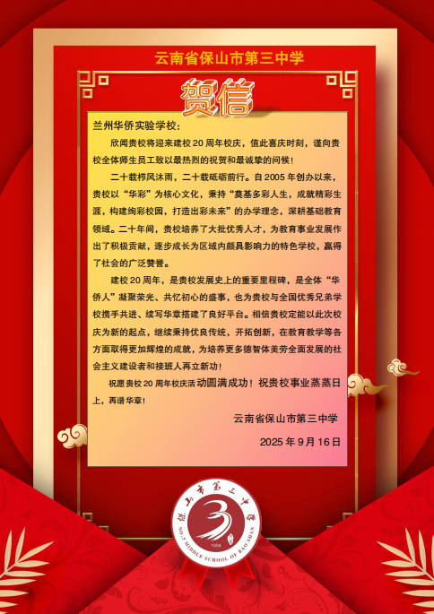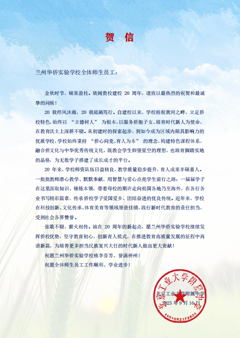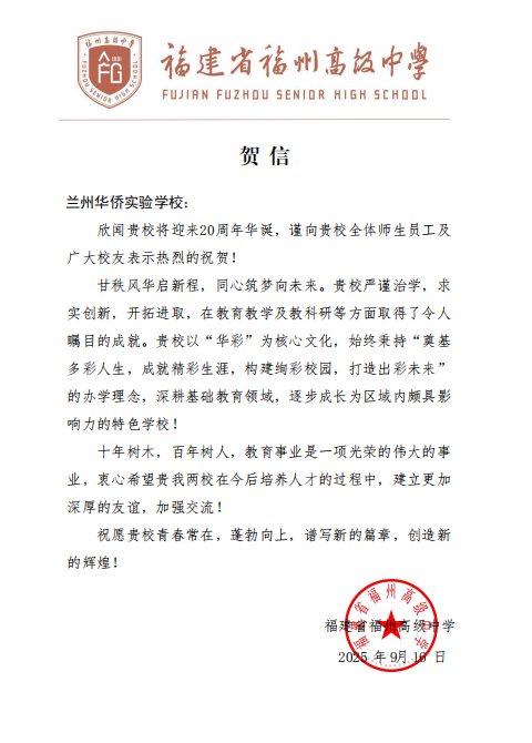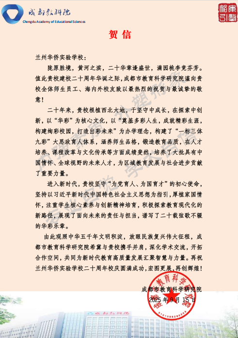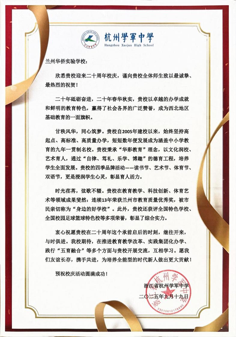 值此建校二十周年华诞之际,来自全国各地的兄弟学校、教育同仁纷纷发来贺信。这些跨越山海的笔墨,既是对学校二十载办学成果的由衷赞誉,更是对教育初心的共鸣、对未来合作的期许。字里行间满含温度,纸短情长承载厚望。谨择取部分贺信与全体师生、校友及社会各界友人共飨这份沉甸甸的教育情谊,见证华侨实验学校与教育同行携手共进的美好图景。
