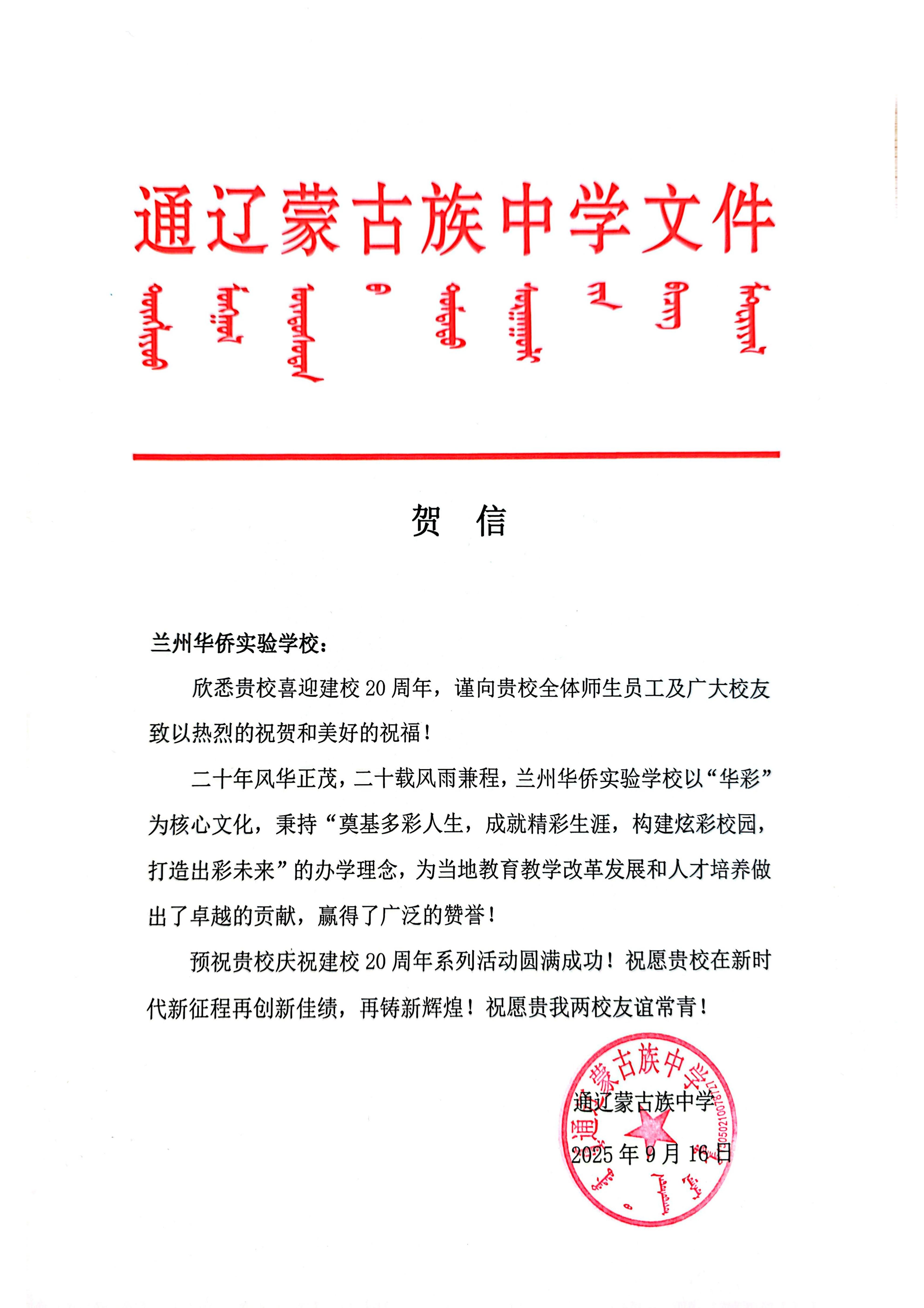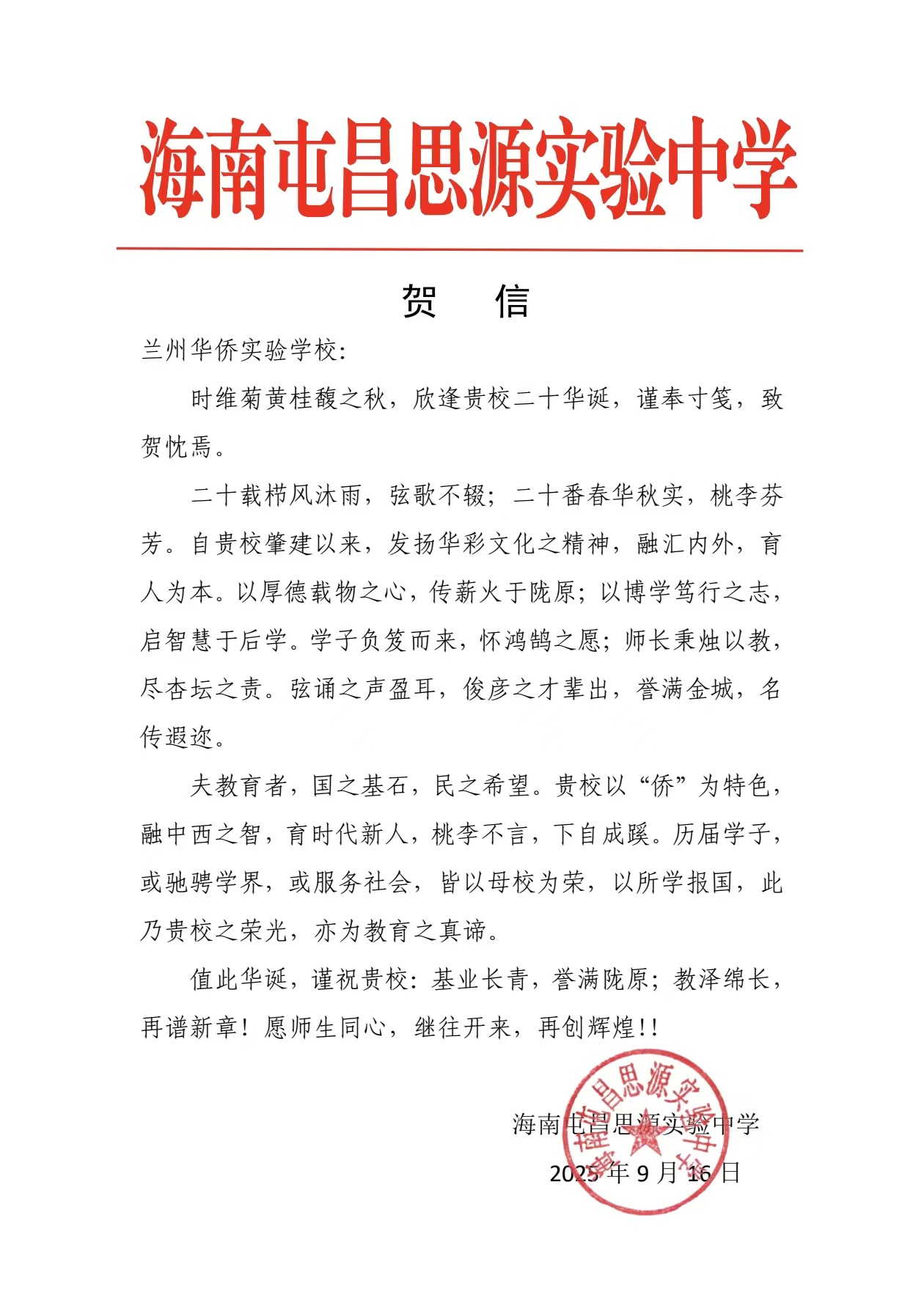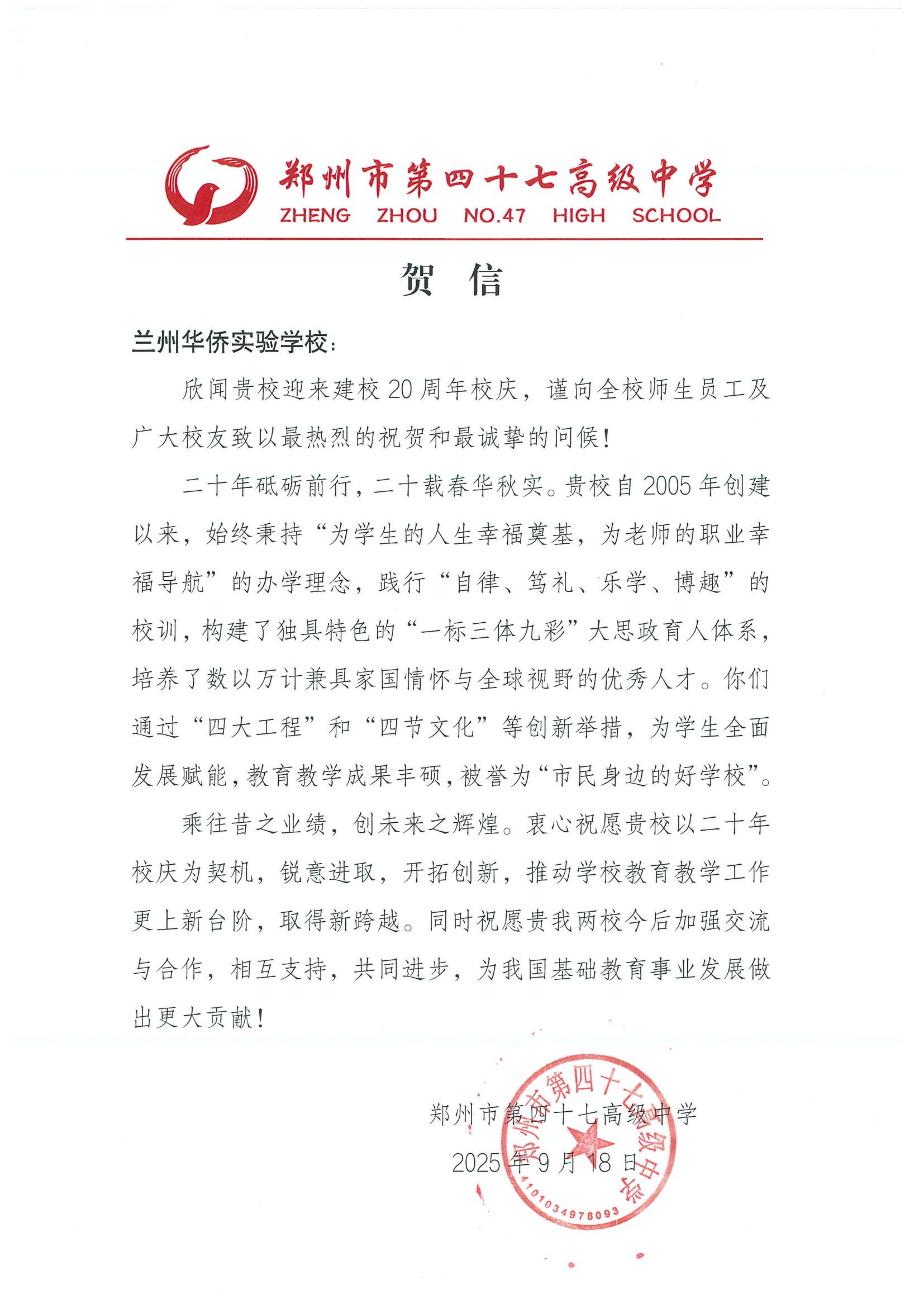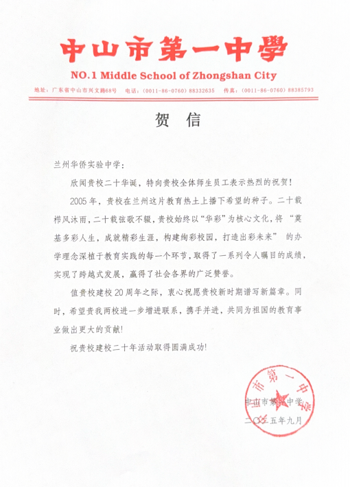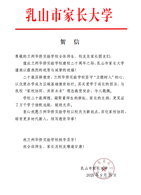 值此建校二十周年华诞之际,来自全国各地的兄弟学校、教育同仁纷纷发来贺信。这些跨越山海的笔墨,既是对学校二十载办学成果的由衷赞誉,更是对教育初心的共鸣、对未来合作的期许。字里行间满含温度,纸短情长承载厚望。谨择取部分贺信与全体师生、校友及社会各界友人共飨这份沉甸甸的教育情谊,见证华侨实验学校与教育同行携手共进的美好图景。