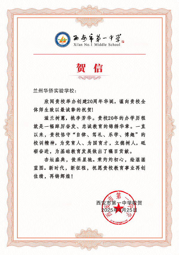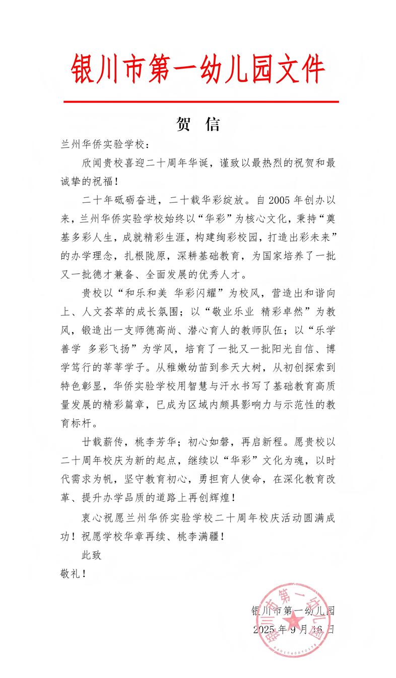 承誉笃行致远,携手共赴新程。一页页贺信,是认可,更是鞭策;一声声祝福,是期许,更是动力。华侨实验学校深知,二十周年并非终点,而是迈向更高质量教育的新起点。愿以廿载校庆为契机,与所有关心支持学校发展的教育同仁、社会贤达一道,怀揣对教育的赤诚与热爱,共探育人新路,共谱教育华章!