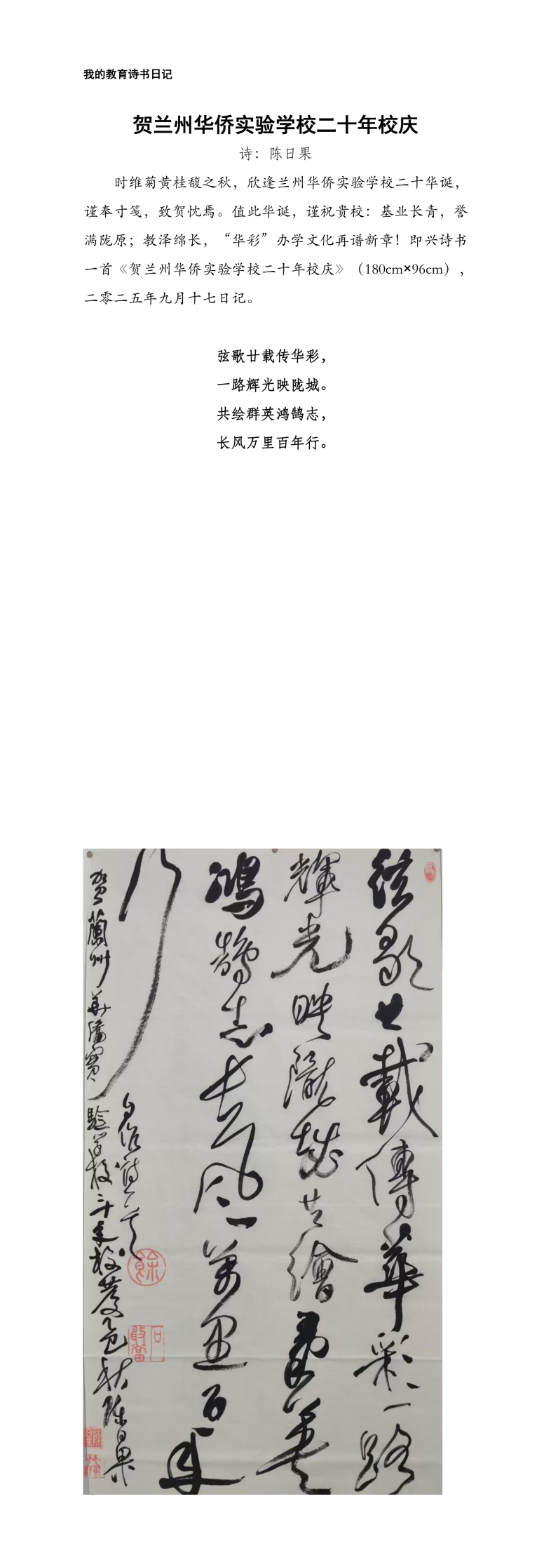 春华秋实二十载,弦歌不辍育英才。2025年9月,兰州华侨实验学校将迎来建校20周年华诞。学校自2005年创办以来,以“华彩”为核心文化,始终秉持“奠基多彩人生,成就精彩生涯,构建绚彩校园,打造出彩未来”的办学理念,深耕基础教育领域,逐步成长为区域内颇具影响力的特色学校。