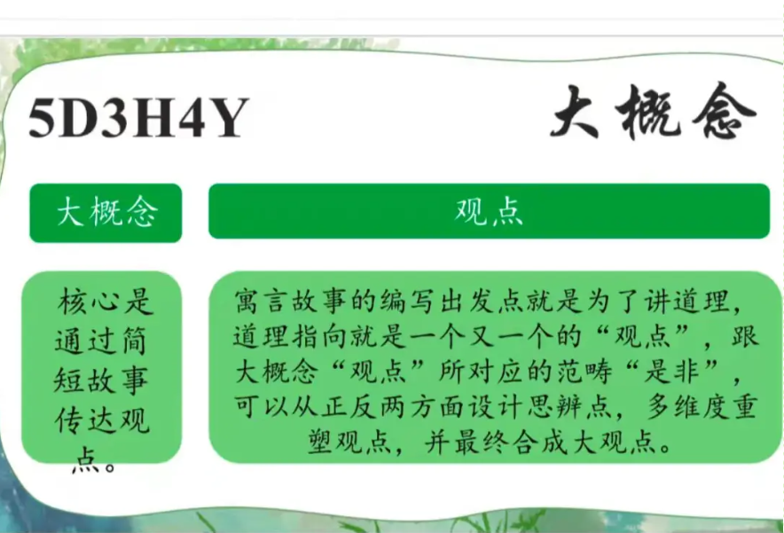 5D3H4Y大概念:观点 核心在于通过简短的故事传达观点。寓言创作的目的就是讲道理,而这些道理往往以“观点”的形式呈现。因此,在教学设计中,我们注重从正反两方面设置思辨点,鼓励学生多维度思考问题,并最终形成自己的大观点。