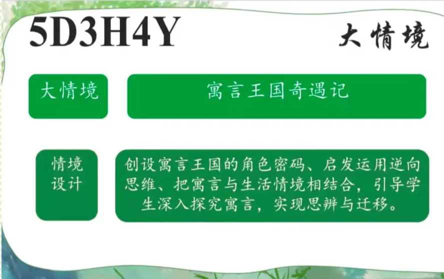 5D3H4Y大情境: 寓言王国奇遇记 创设寓言王国的角色密码、启发运用逆向思维、把寓言与生活情境相结合,引导学生深入探究寓言,实现思辨与迁移。