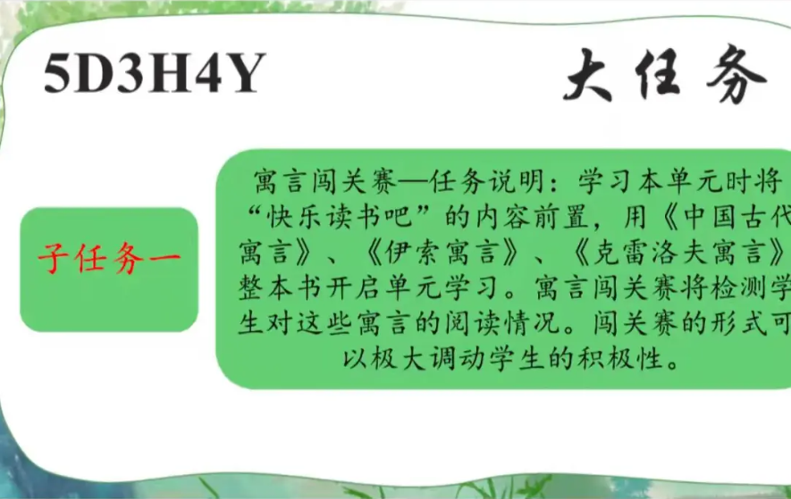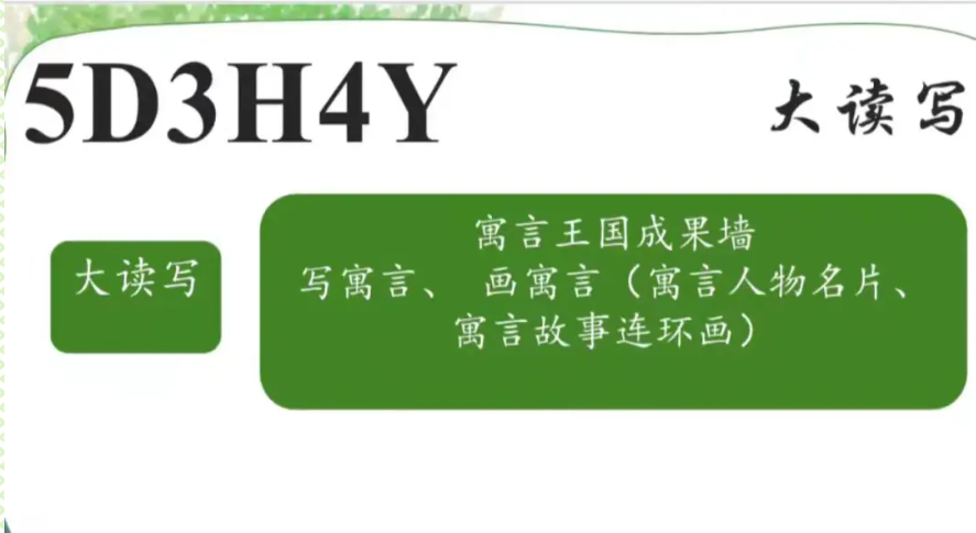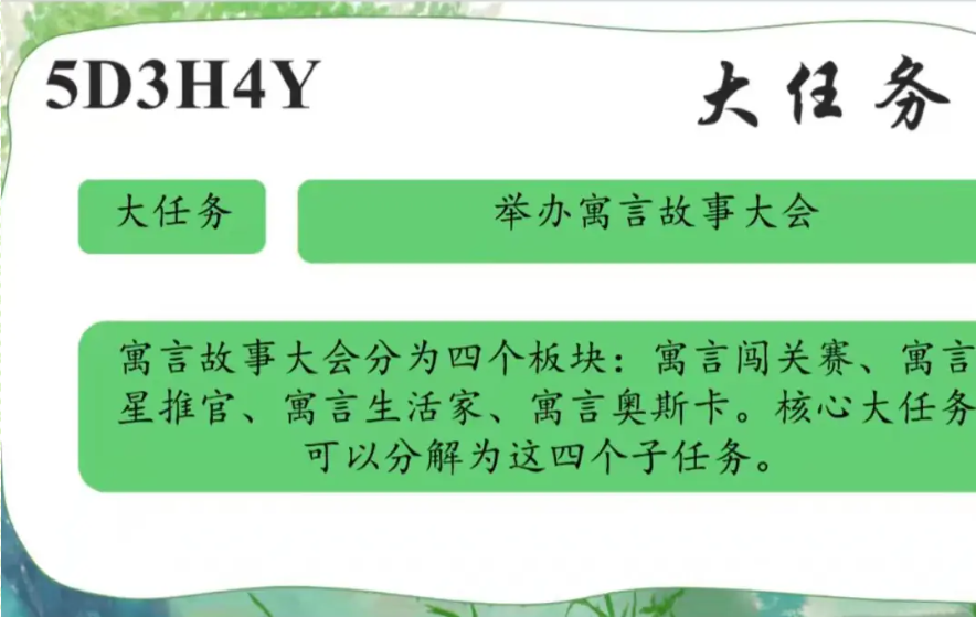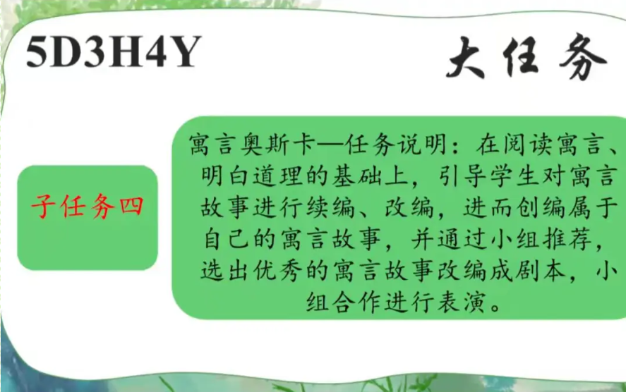 5D3H4Y大任务: 举办寓言故事大会 寓言故事大会分为四个板块:寓言闯关赛、寓言星推官、寓言生活家、寓言奥斯卡。核心大任务可以分解为这四个子任务。 |