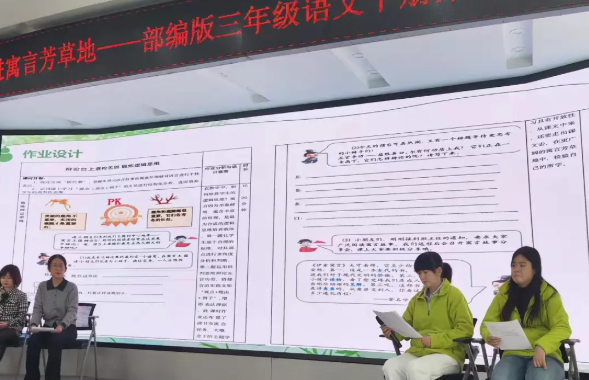 我们认为首先在内容上重视单元整体设计,其次在形式上重视可迁移实践性作业设计, 最后在方式上重视合作性、自主性作业设计。 这样的学习模式不仅能提高学生的学习效率,还培养了他们的团队协作精神。每位成员都可以在交流中获得新启发,共同进步,也能帮助老师对课本有更多形式的开发和理解。 屏幕上的作业设计信息吸引了所有人的目光。寓言王国奇遇记的情境创设让学生仿佛置身于一个神奇的世界,激发了他们探索未知的兴趣。无论是绘制寓言人物名片还是创作连环画,这些任务都体现了个性化与智能化的教学理念。